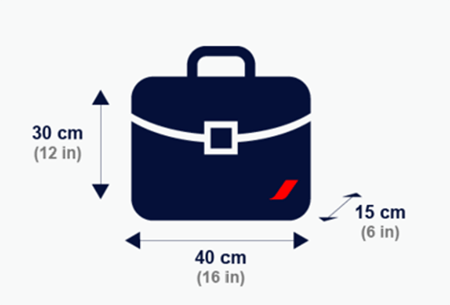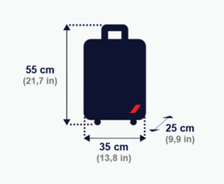 Votre bagage en cabine chez Air France ne doit pas dépasser 55 cm x 35 cm x 25 cm. Votre accessoire supplémentaire ne doit pas dépasser 40cm x 30cm x 15cm.